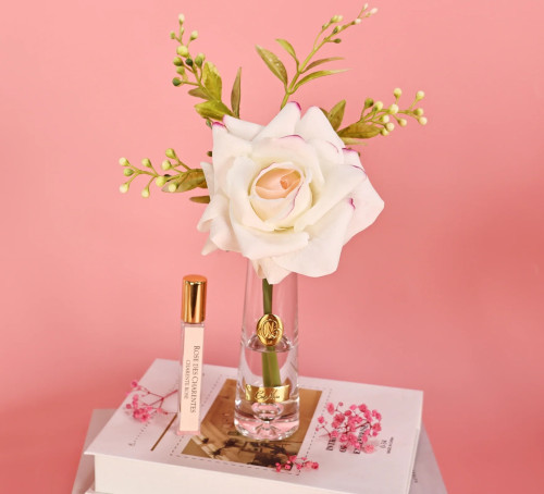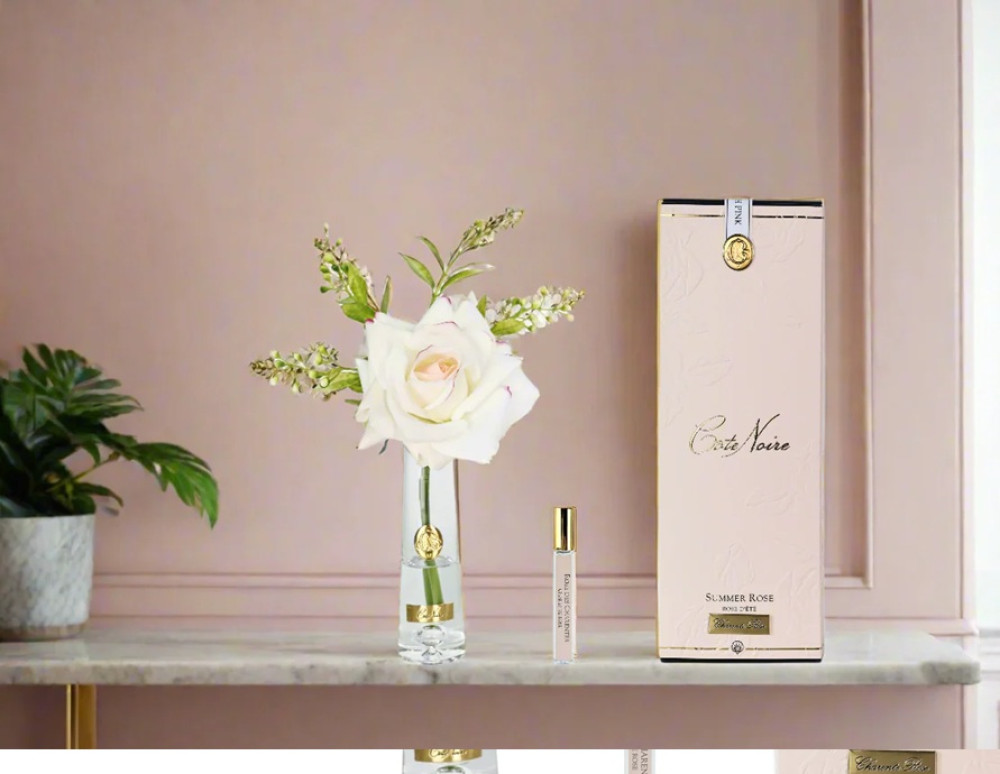 Каждая композиция «Летняя роза» с натуральным ароматом искусно изготовлена ​​вручную и помещена в гель, напоминающий воду. Каждый лепесток покрыт особым натуральным слоем, что придаёт композиции реалистичность и вид. Композиция помещена в прозрачную, элегантную вазу с золотой эмблемой.